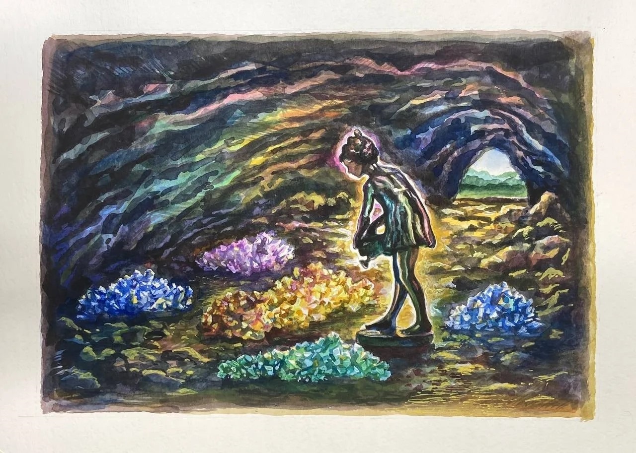 Графический лист "Девочка с лейкой", бумага, акварель, 36х26,5, 2024, в оформлении