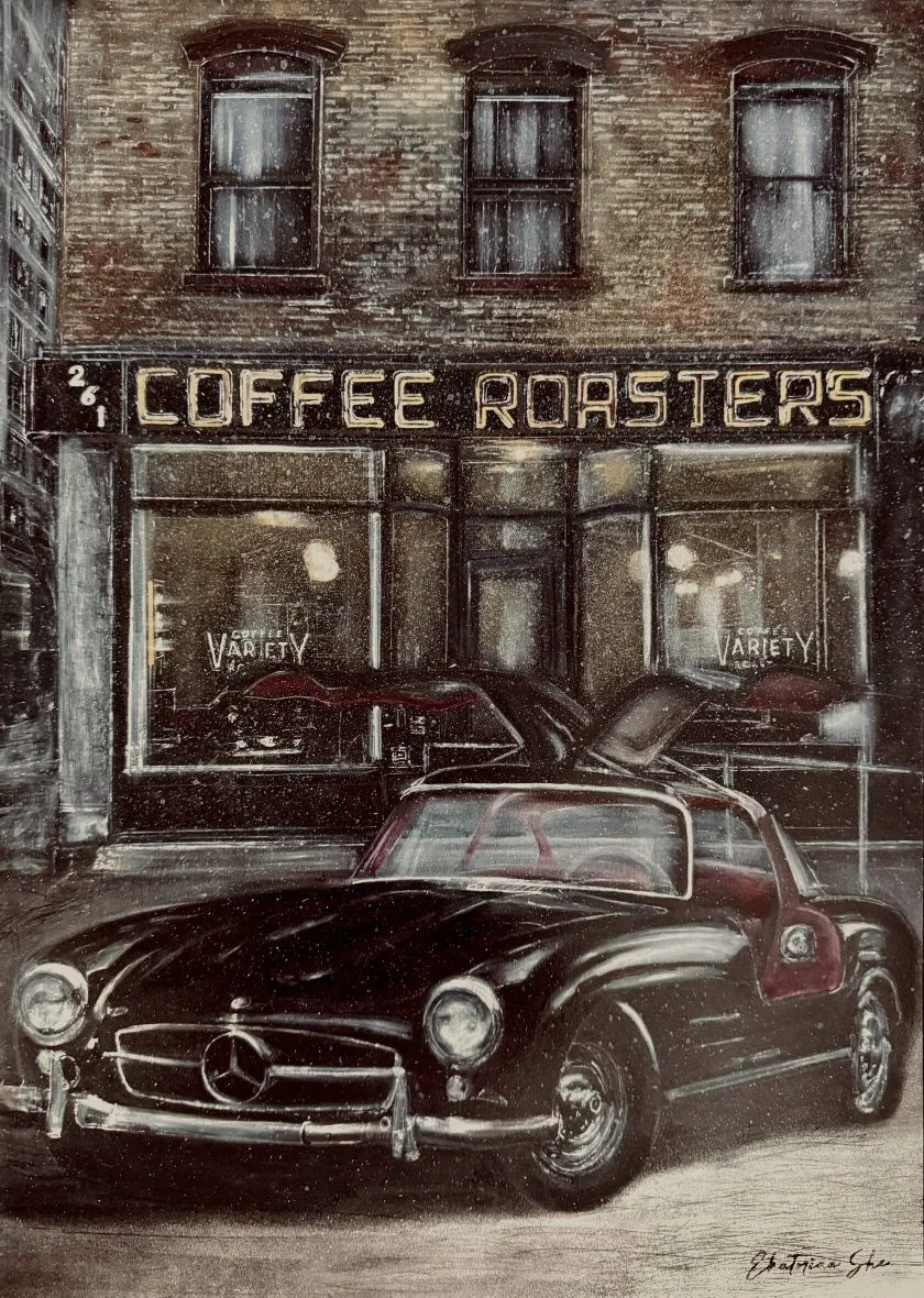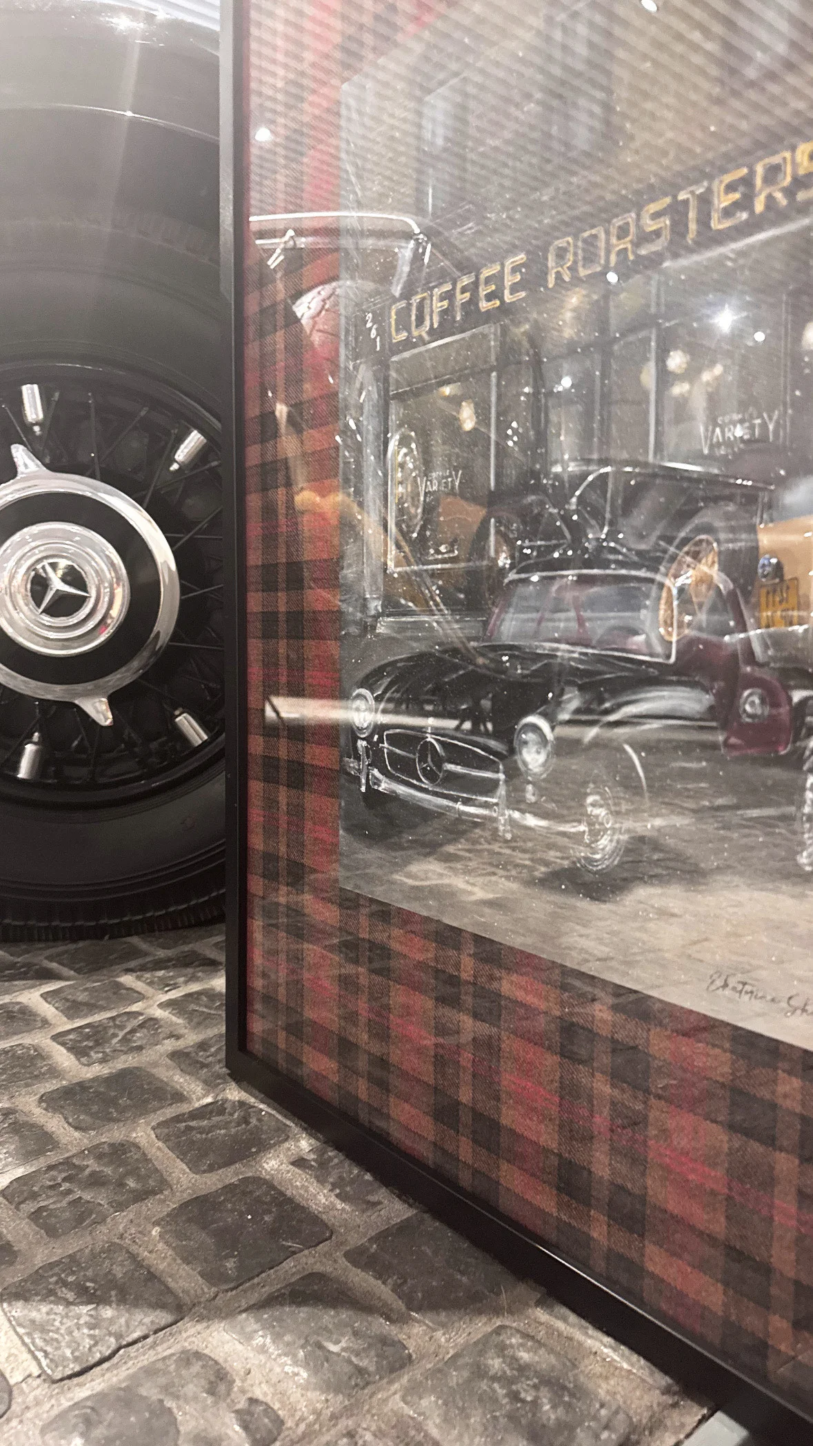 "РЕТРО РАЛЛИ "Mersedes 300sl "coffee roasters", 65х80, шерсть английская обивочная, синтетическая бумага, пастель, масло, музейное стекло