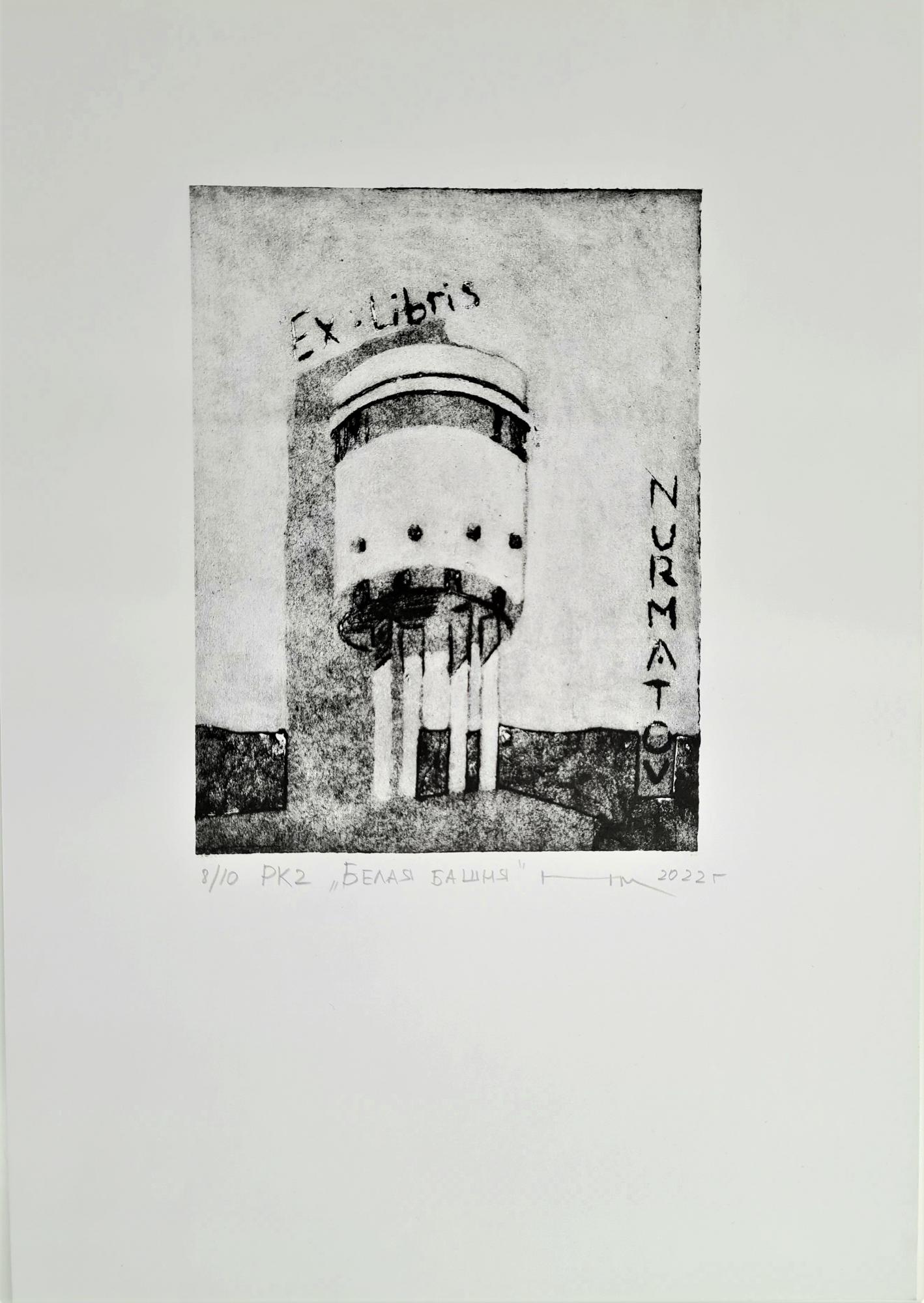 Работа из серии «Памятники конструктивизма» изображает известное каждому горожанину здание – Белую башню. Простые и лаконичные формы архитектурного строения подчеркиваются тональными контрастами и шрифтом. Работа выполнена в технике гравюры на картоне глубокой печати, где каждый оттиск получается уникальным, тираж всего 10 штук.